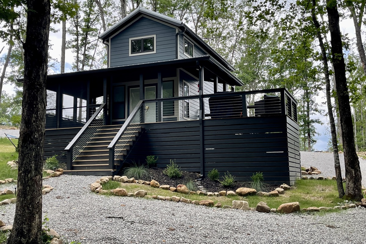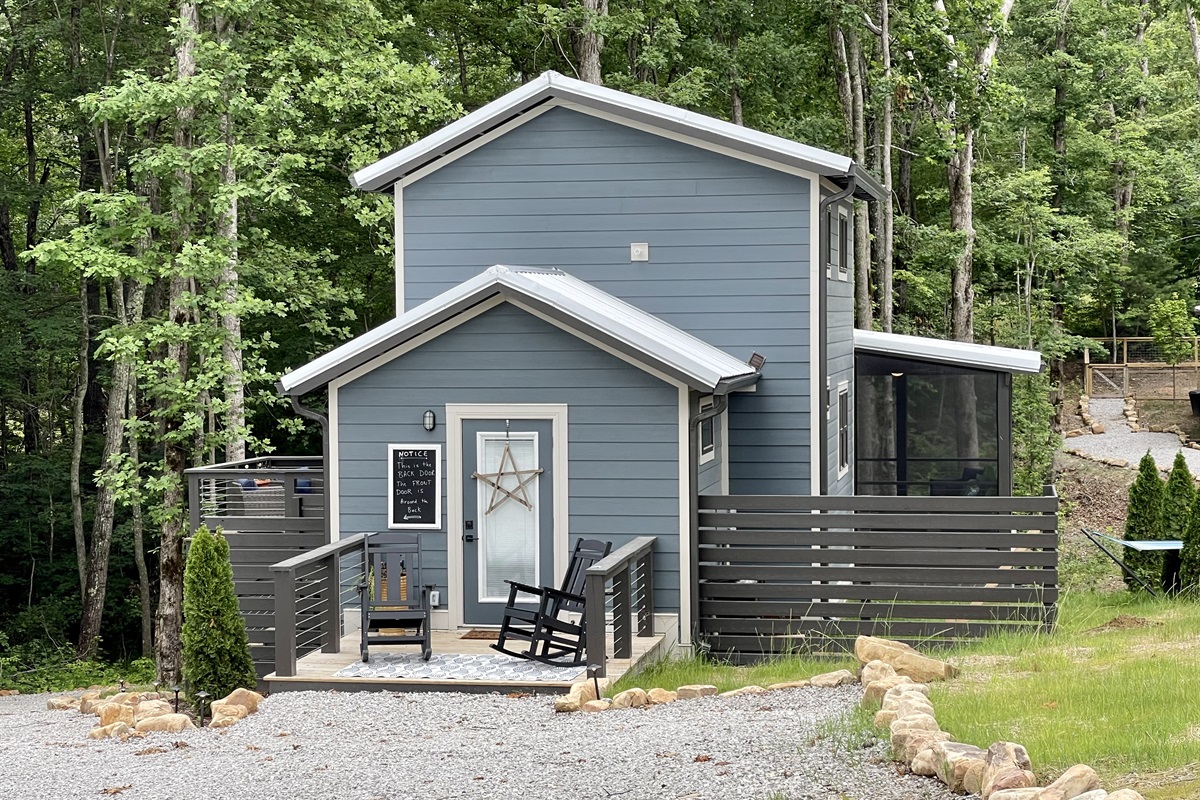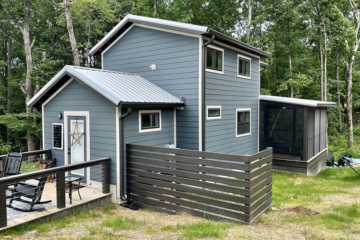 With its minimalist design and cozy atmosphere, Bluebonnet is spacious yet compact enough to maintain the character of a true tiny home experience with sleeping accommodations included in the master bedroom, an upstairs loft, and a set of mini bunks in the downstairs hall for the little tikes in your life. The exterior has much to offer, including a screened deck, a grill, rocking chairs, and a hammock.