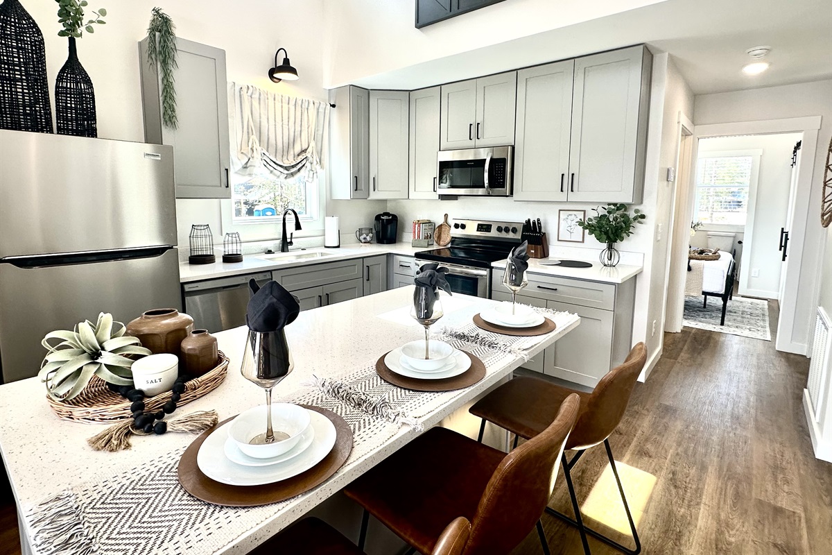The bright, fully stocked kitchen features modern appliances, coffee maker, dishwasher, and all essentials for breakfast, lunch, or dinner. The open layout encourages cooking together and casual, leisurely meals.
