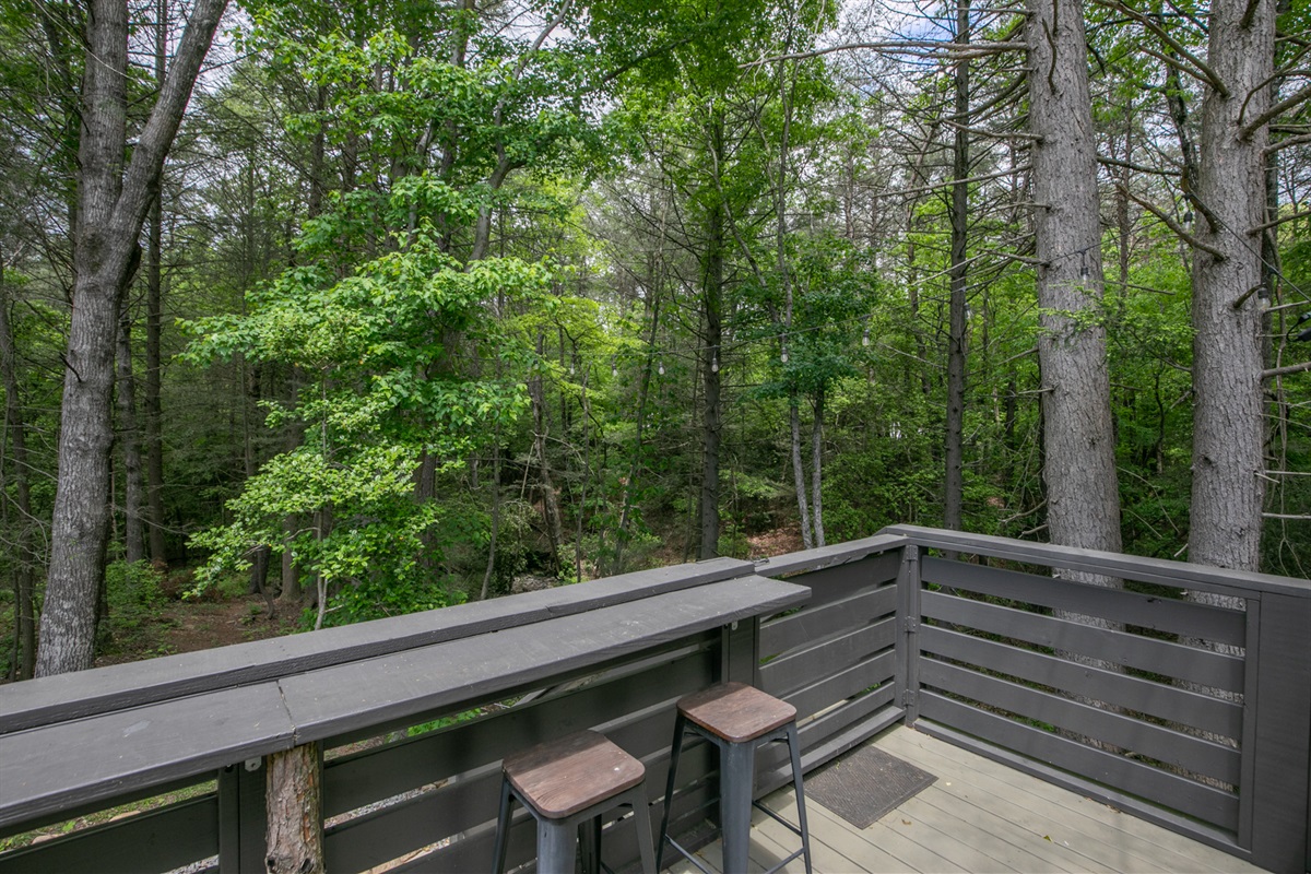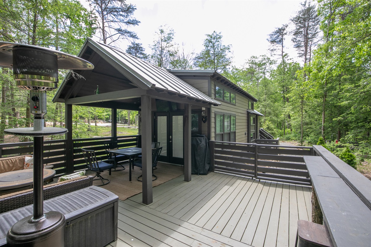 Outdoors, a large deck overlooks a flowing creek and features a cushioned sofa, outdoor dining, a free-standing heater, and a mini bar. A separate patio firepit adds even more magic to the experience.