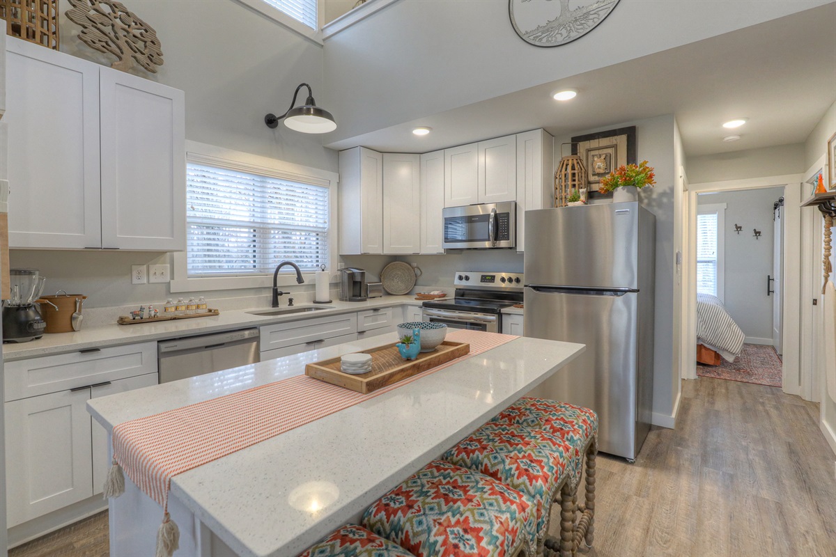 Beautiful and well maintained property. Our favorite part was the stairs to the upper level and the full-height loft. With all seasoned adults, it was important to have easy access to the upper level. We had to prepare several large meals and all needed equipment was available. We appreciated the full size appliances and the Keurig! Hope to return for a longer stay some day!