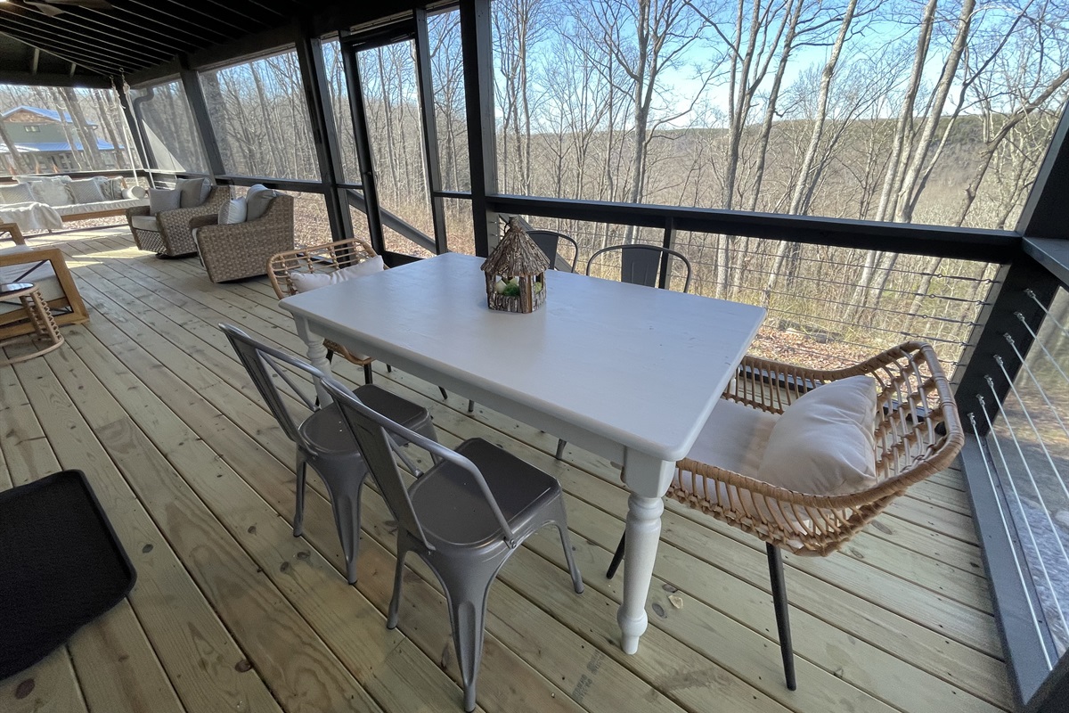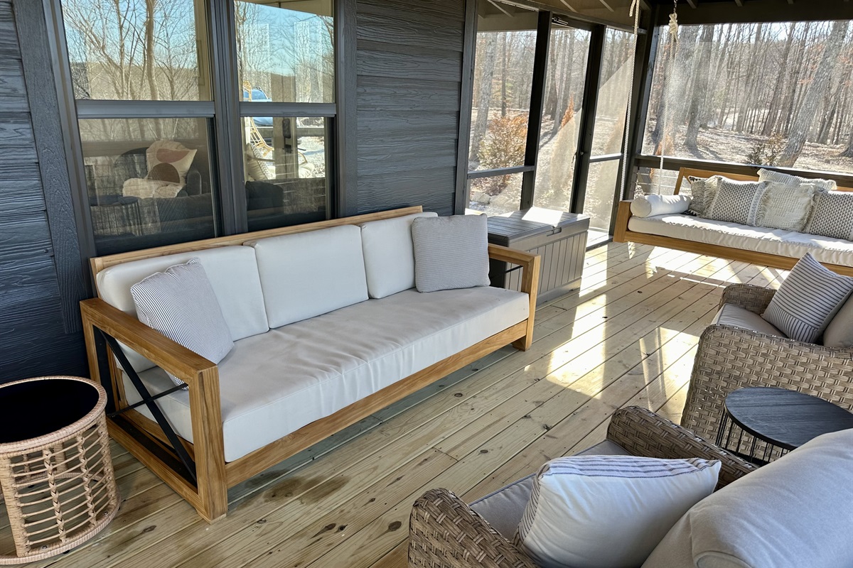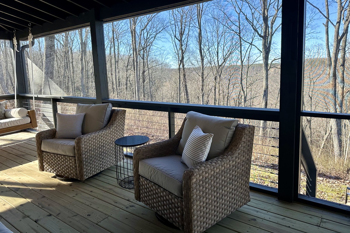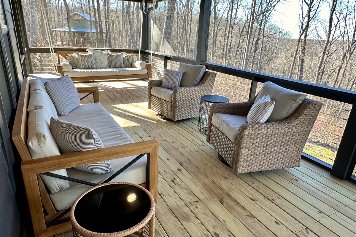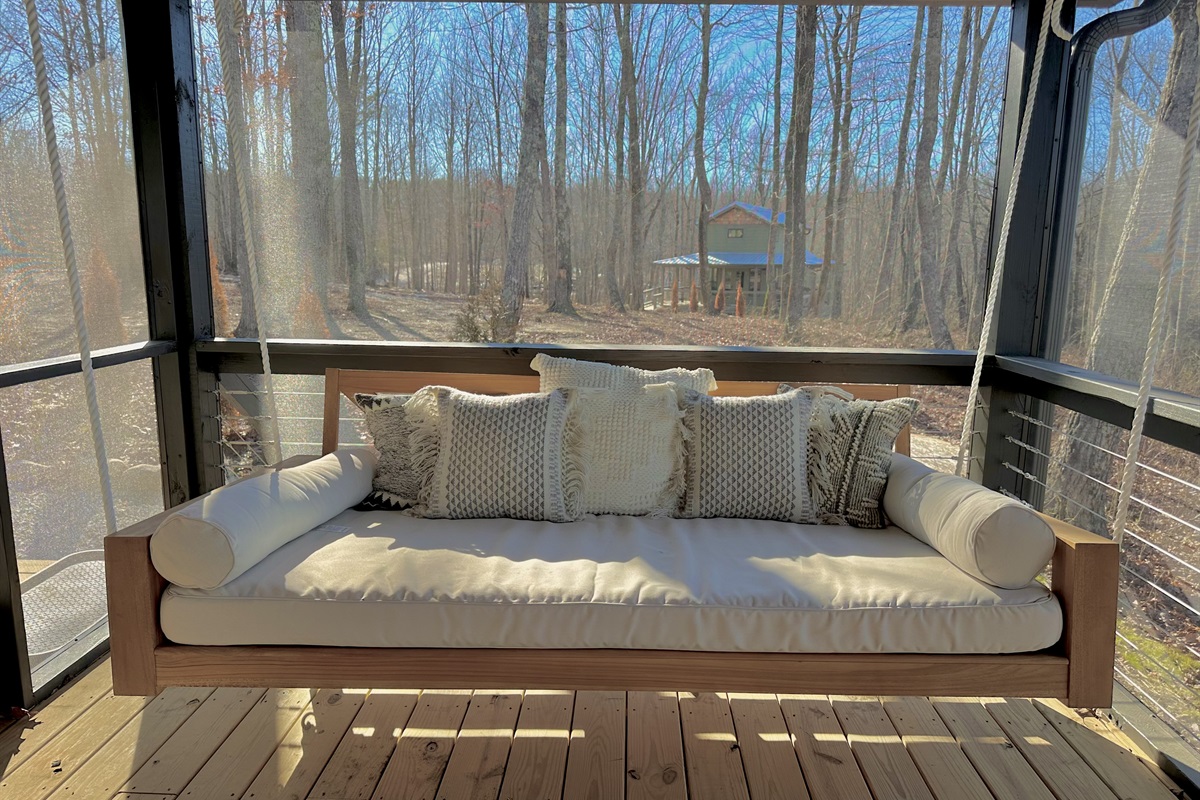 Outdoors, relax in the screened-in bed swing, take in golden hour from the porch swing, or gather around the firepit under string lights with the bluff stretching endlessly beyond.