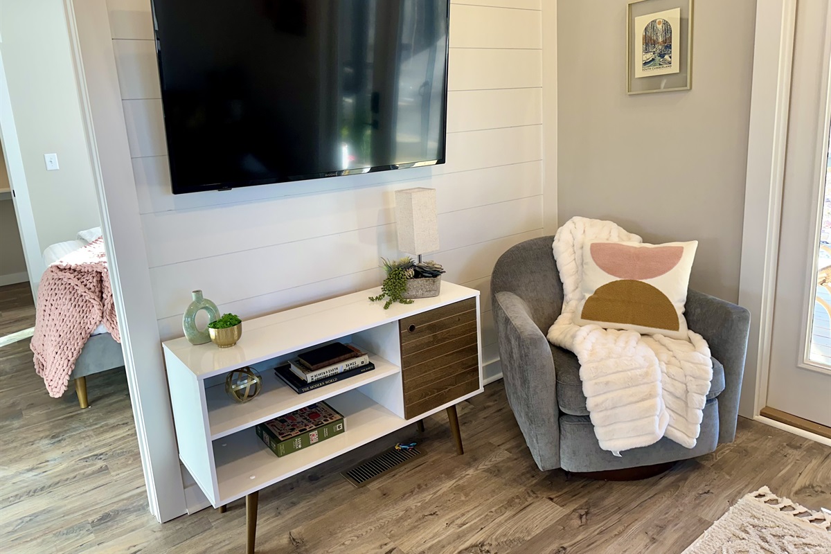 Unwind in the inviting living area with a TV and an open-concept layout flowing into the dining space, perfect for shared meals, laughter-filled game nights, or cozy evenings in