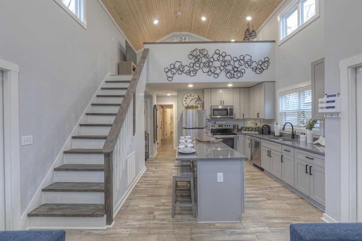 We stayed 3 nights at Sunset Wonder with our four boys (aged 3-9). While this is a tiny home we did not feel cramped at all. The decor is perfect. The layout was great with kids loving the loft space. The boy especially loved how close we were to the community dock and playground. The kitchen was well stocked to prepare just about any dish. We had a great time and highly recommend this unit.