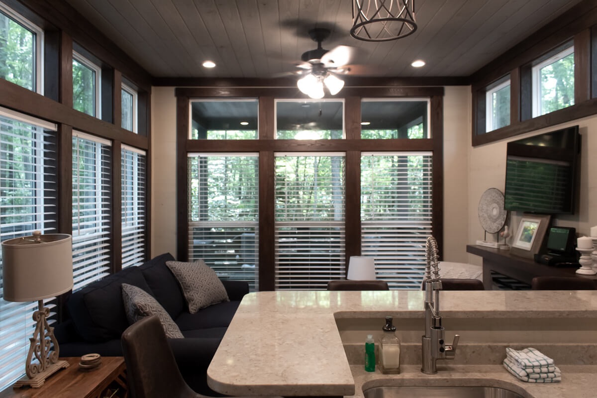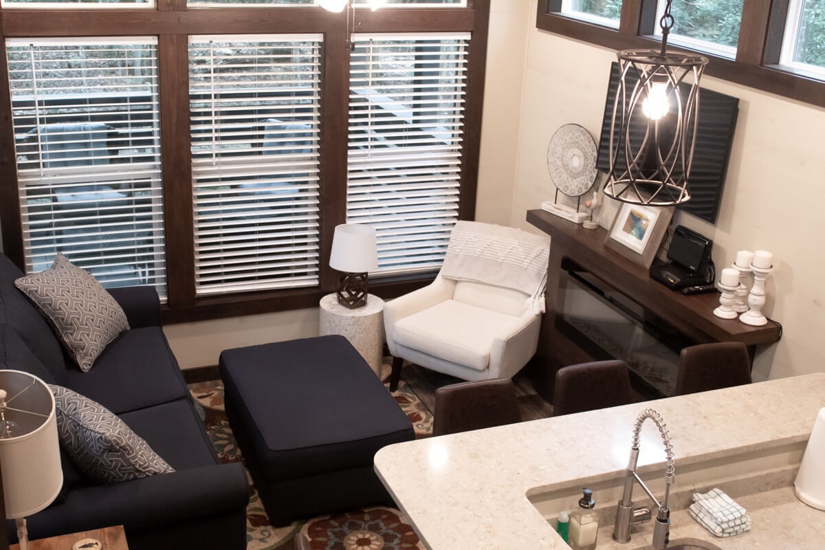 Located within a private, gated community atop Monteagle Mountain, the home features a fully equipped kitchen, a lofted sleeping area, a cozy fireplace, and a private master bedroom—thoughtfully designed within 400 square feet of stylish, efficient living.
