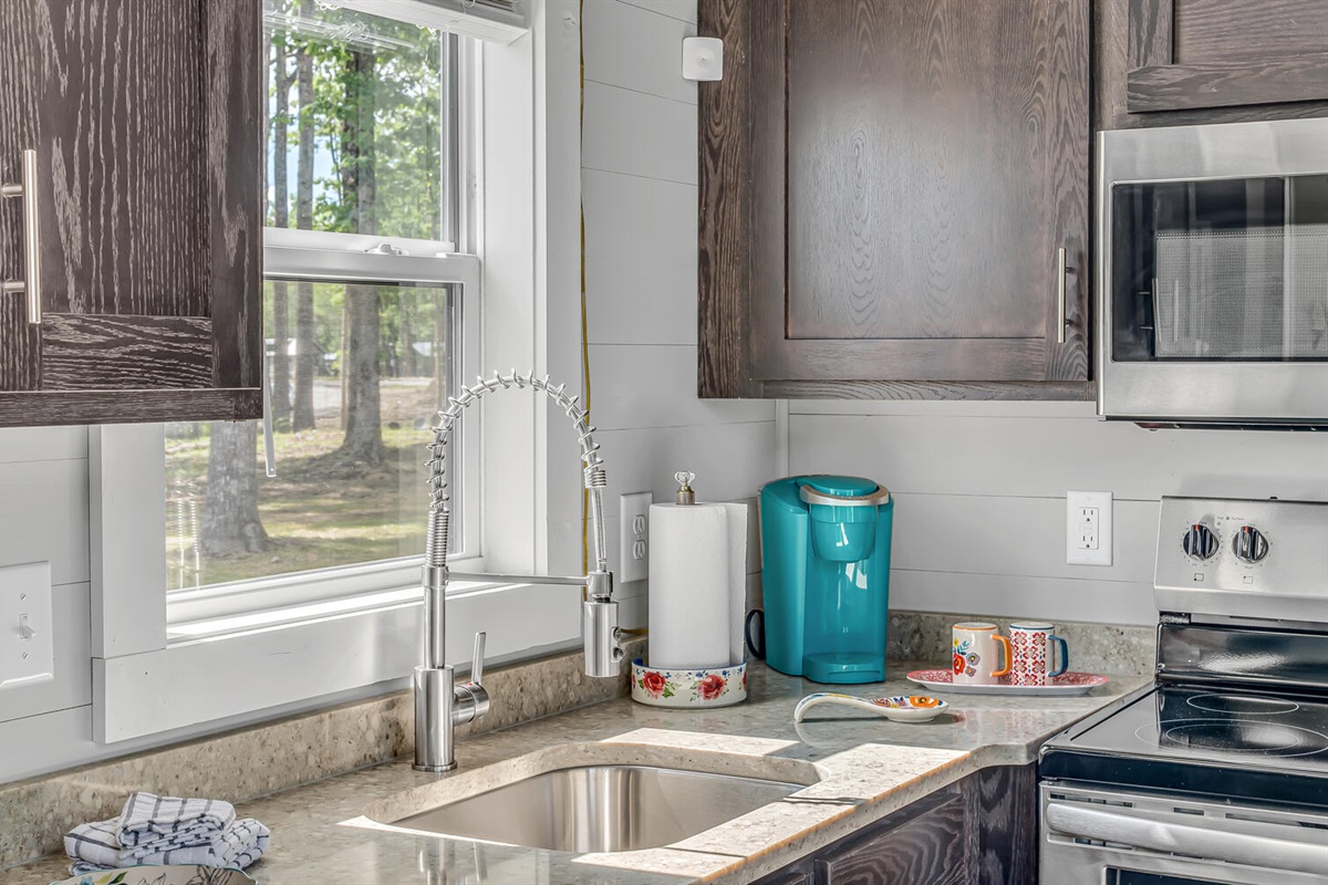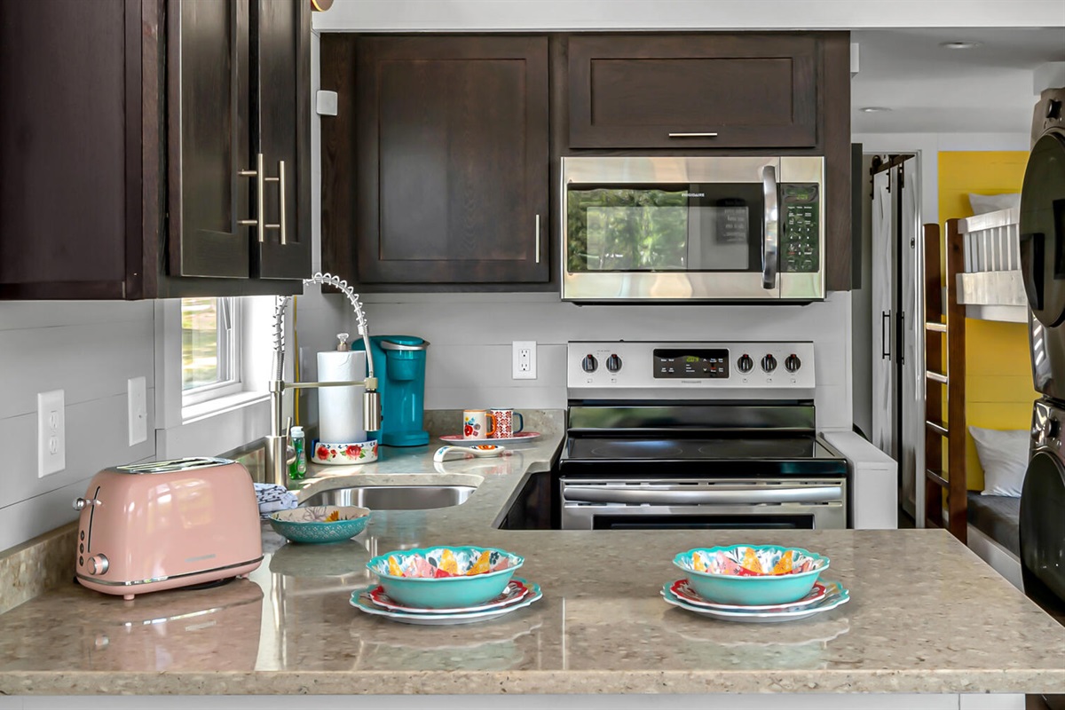 Step into the bright, fully equipped kitchen featuring modern appliances, coffee maker , dishwasher, and all the essentials to make breakfast, lunch, or dinner a breeze.