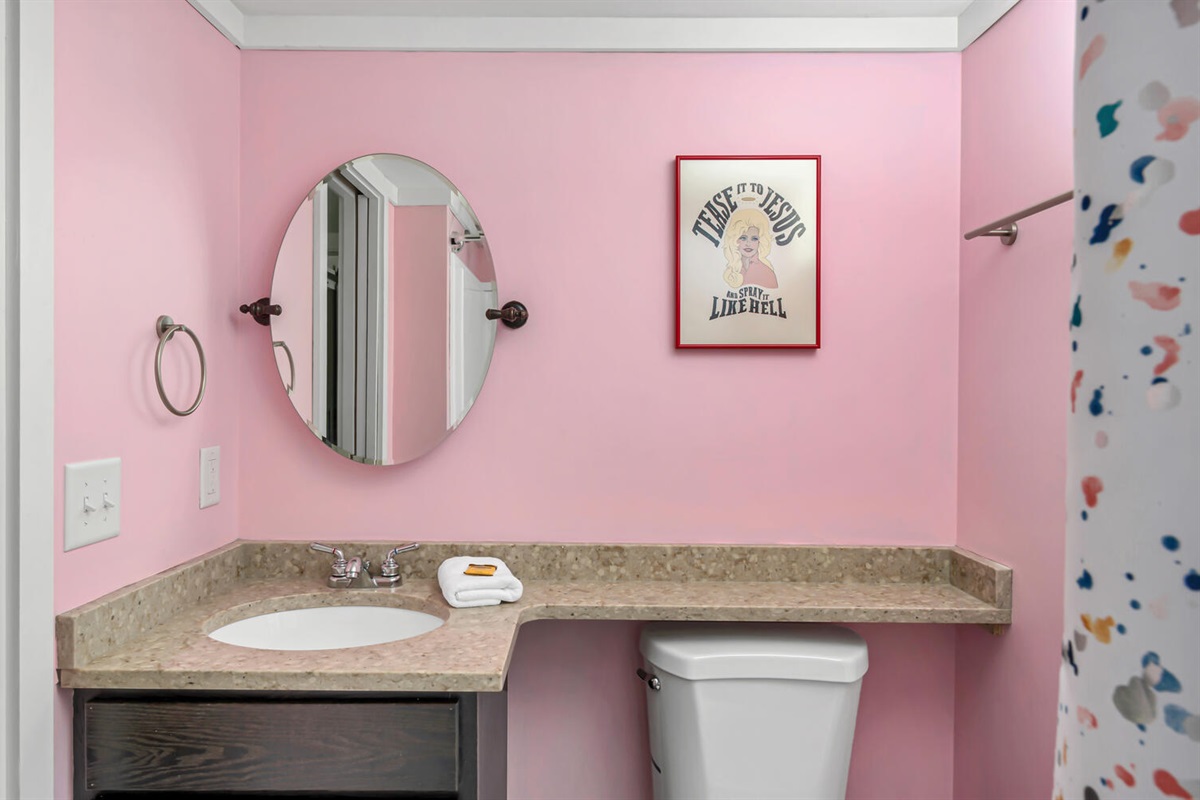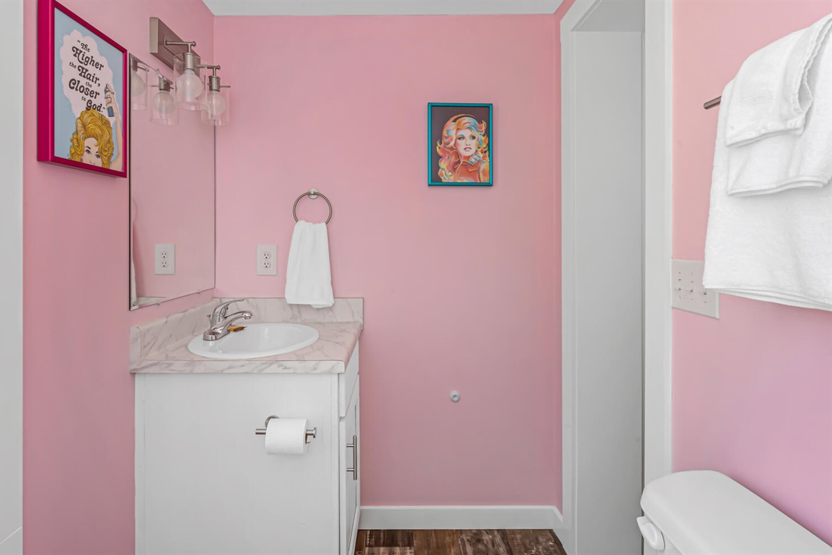 The Dolly house was just what we were looking for. My daughter is a huge Dolly fan, so all the pink & Dolly touches were perfect. The house was cozy & had plenty of room for all our guests. The hot tub & landing area overlook the lake. The lighting around the fire pit area made it a great place for the girls to hang out. We had a great weekend!
