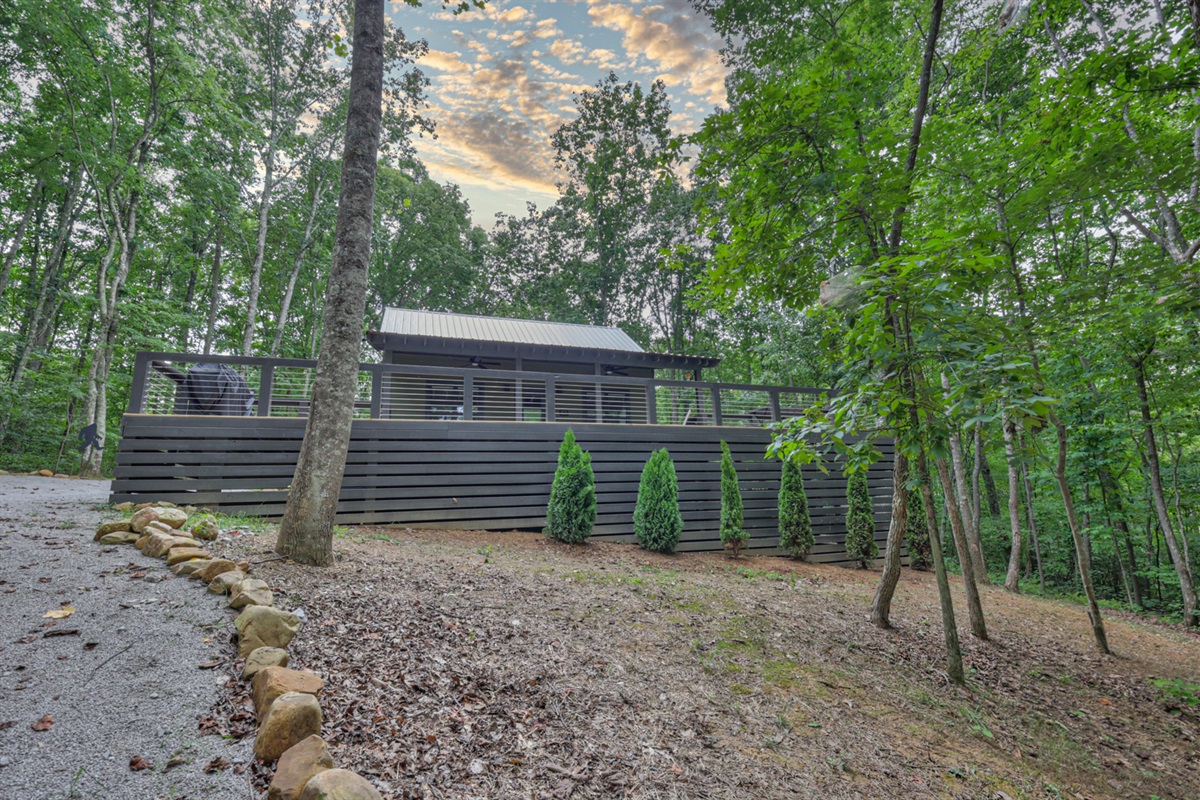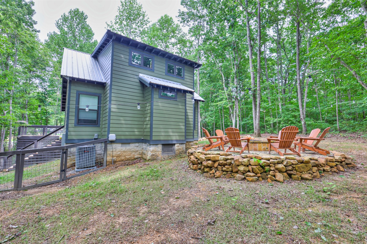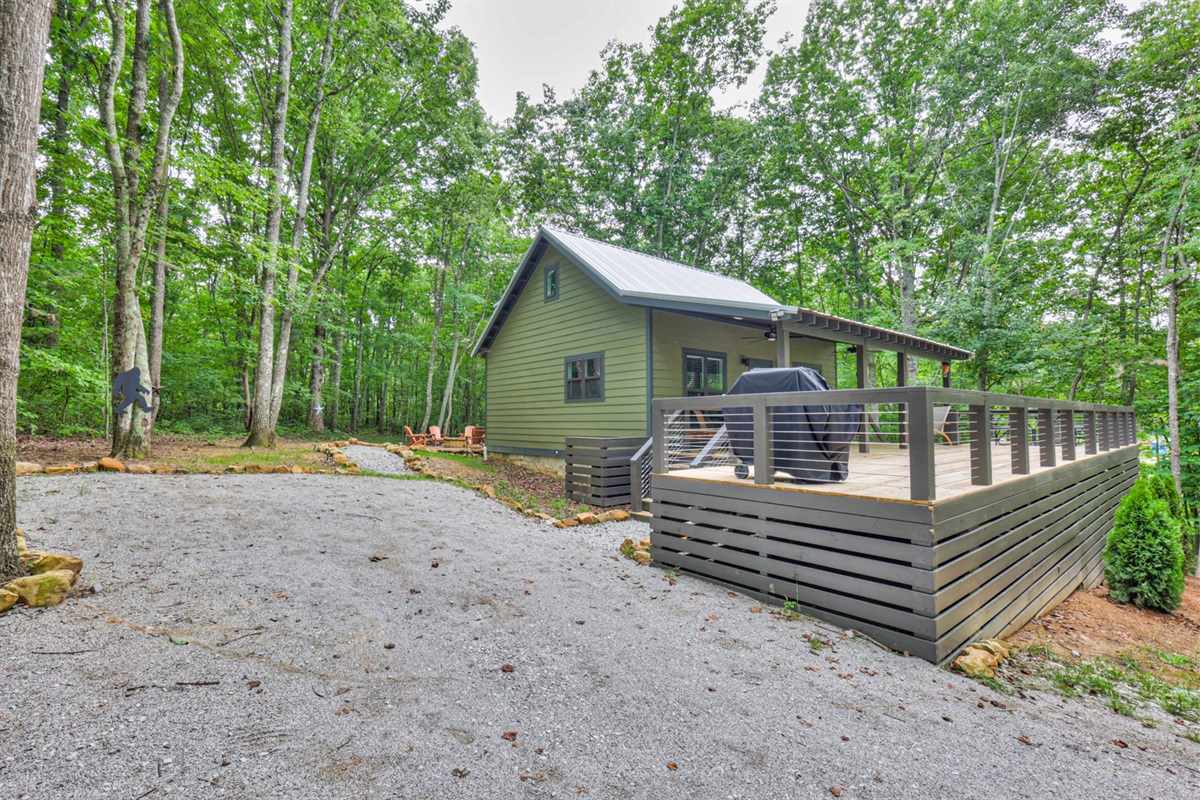 Featuring a dedicated home office, a stylish den with vintage vibes and a record player, plus an expansive deck for entertaining, this home redefines tiny living. Surrounded by wooded privacy and mountain beauty, it also boasts a firepit, fenced yard for pets, and serene nature views from every window