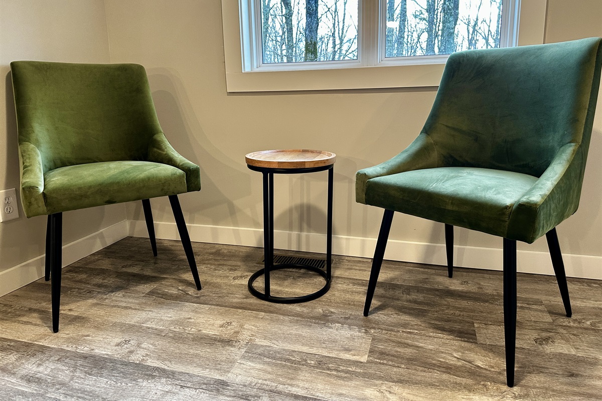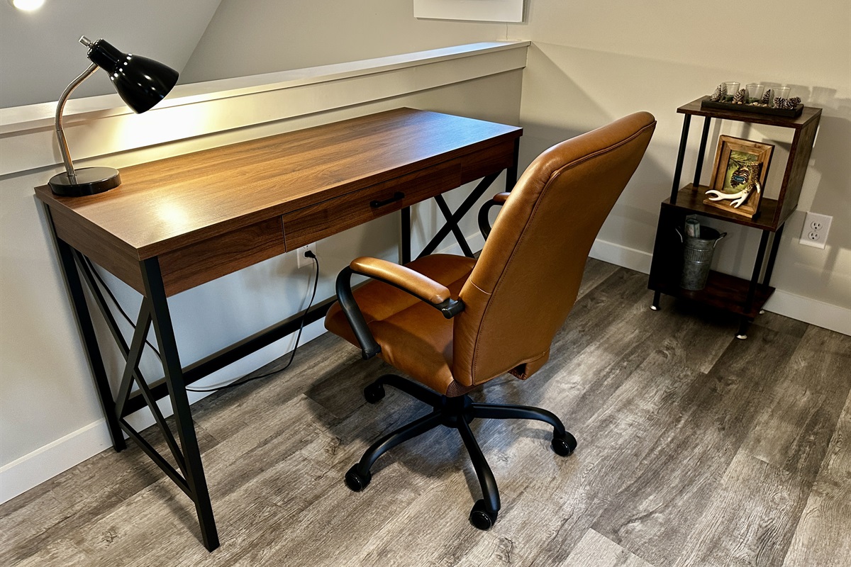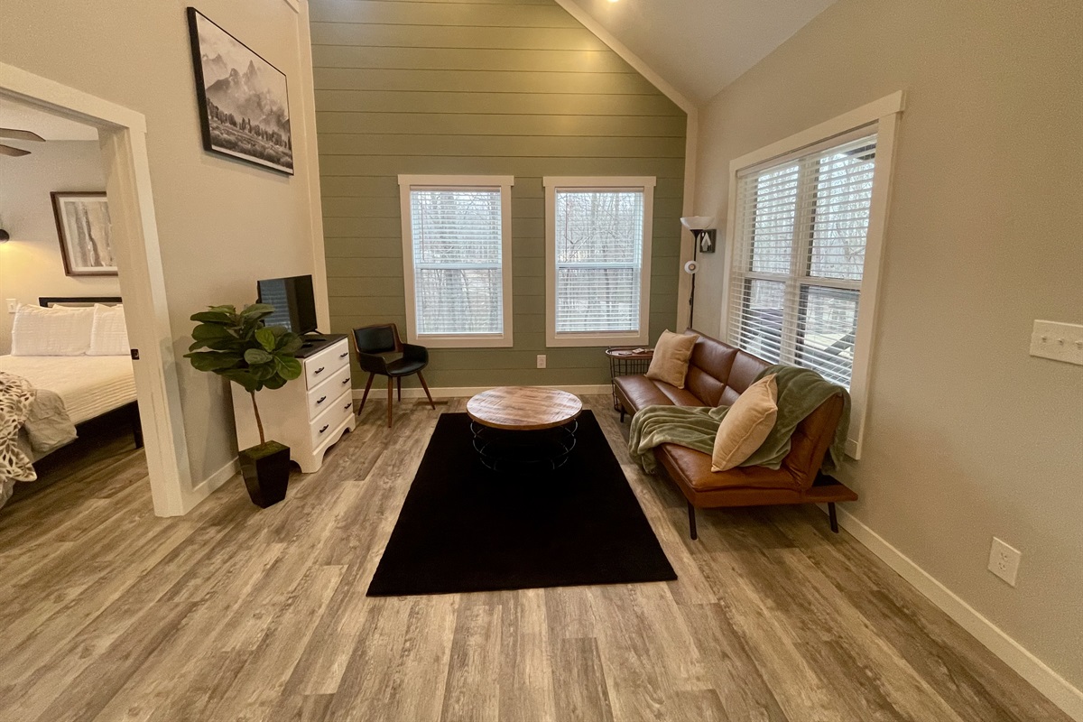 A private, welcoming space with comfortable seating, a Smart TV, and a dedicated workspace, perfect for relaxing or staying connected when needed.