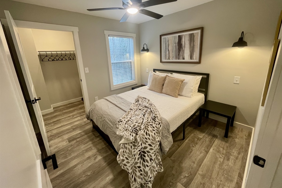 • Bedroom 1: Queen bed dressed in plush linens for peaceful, restorative nights