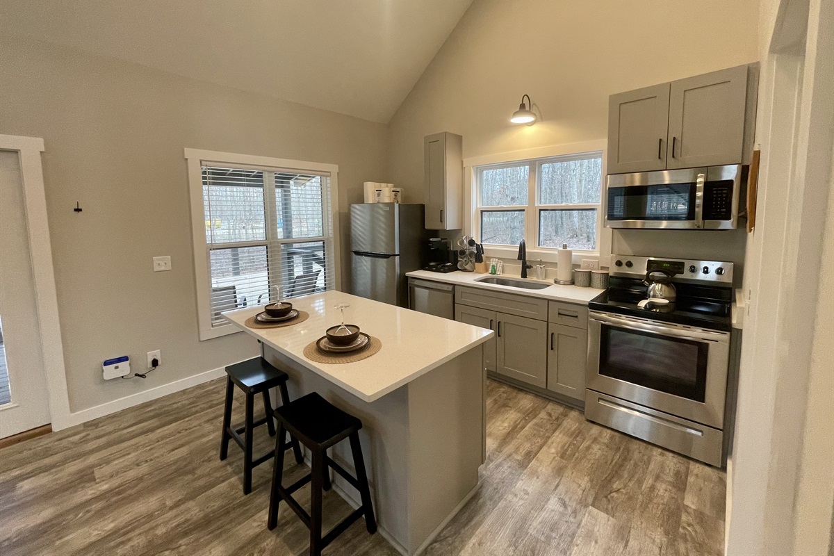 A fully stocked, stylish kitchen featuring modern appliances, cookware, and utensils, ideal for brewing your morning coffee, preparing quick bites, or crafting gourmet meals with ease.