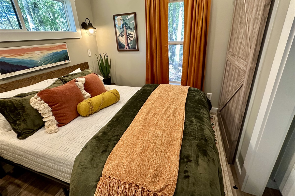 -Master Bedroom: Queen bed with balcony access , premium linens, and stunning mountain vistas to wake up to