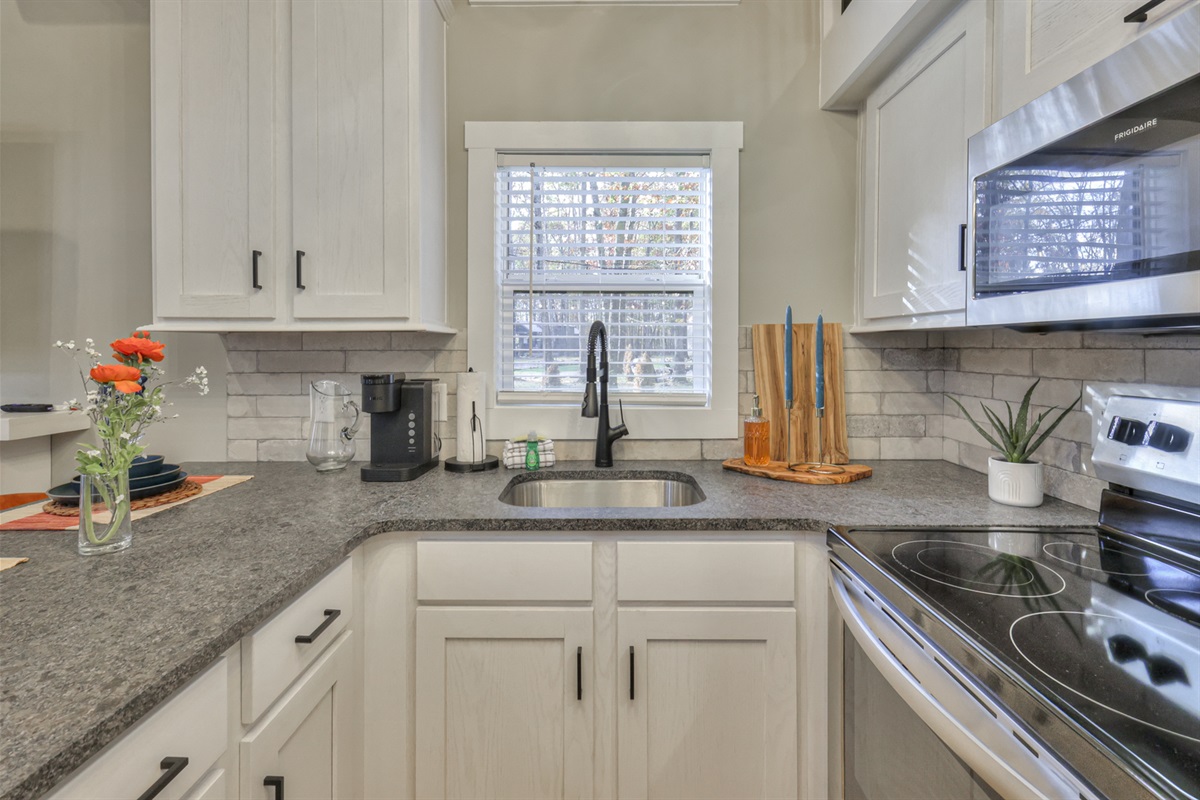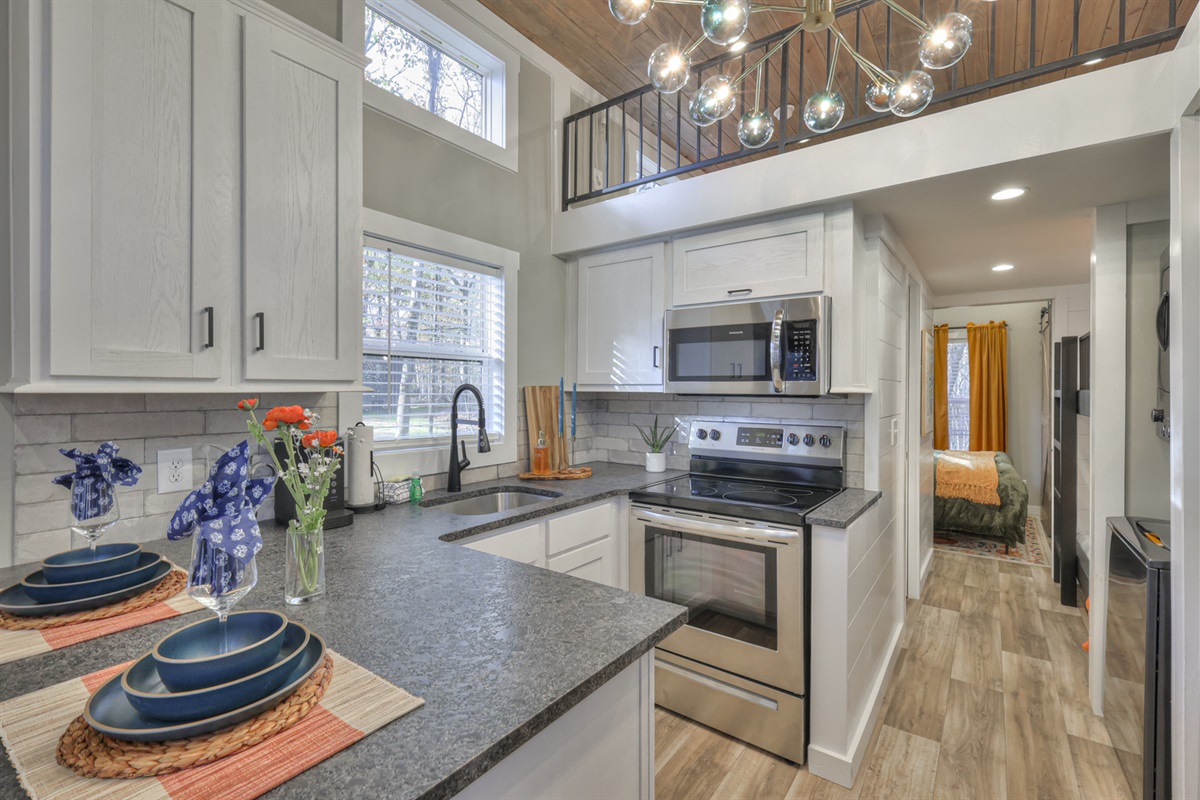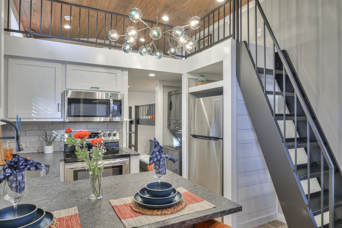 The bright, fully stocked kitchen comes with modern appliances, cookware, and utensils , perfect for crafting a hearty breakfast, a family dinner, or simply enjoying your morning coffee while gazing at the mountains.