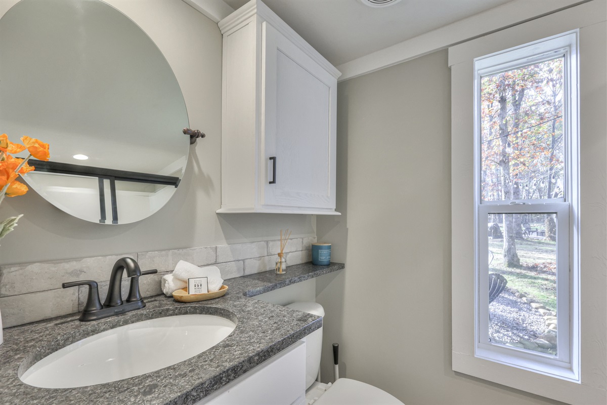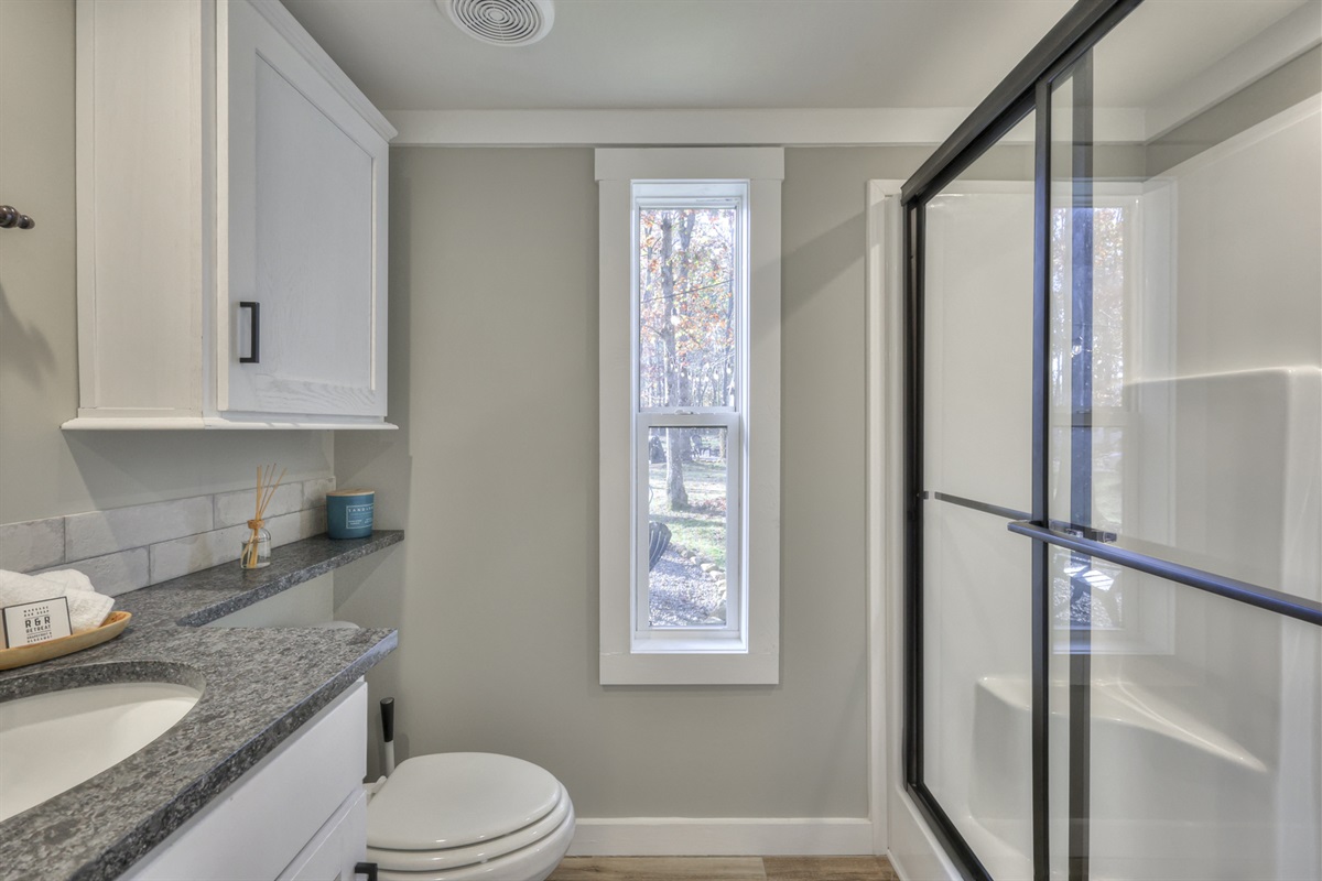 One clean, modern bathroom thoughtfully stocked with essentials provide a refreshing space to unwind after a day of hiking, exploring, or relaxing.