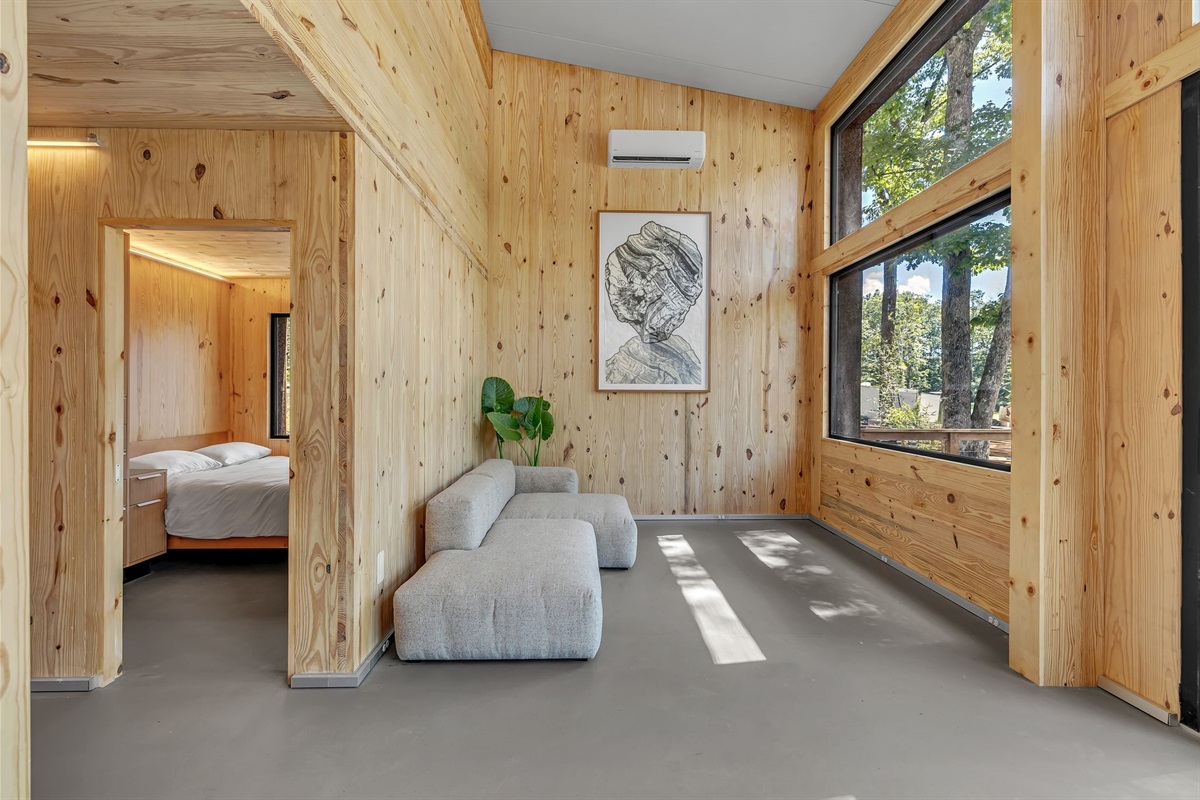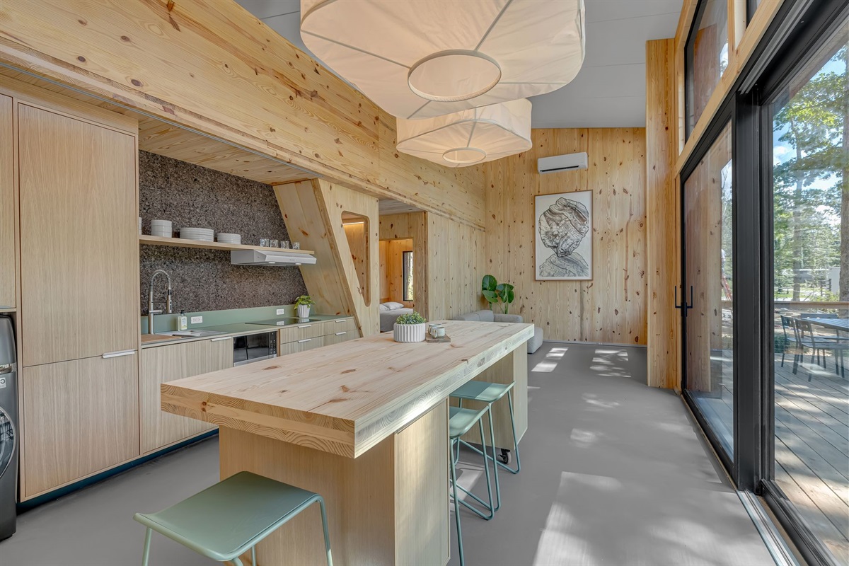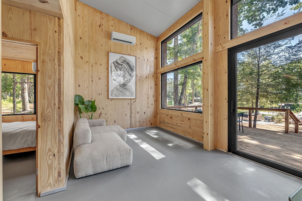 The living space is filled with natural light from oversized windows, offering cozy seating and beautiful forest views. The dining area flows seamlessly from the kitchen—perfect for shared meals, games, and conversation.